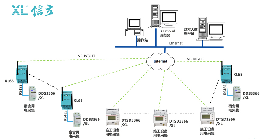 實時采集建筑工地施工設備的用電數據,上傳到云平臺;實時監控工地宿舍用電情況,上傳數據到云平臺;在云平臺建模,計算、分析、統計施工設備用電數據,工地宿舍人員用電數據,超出常規時,發出報警信息,及時通知相關工作人員;