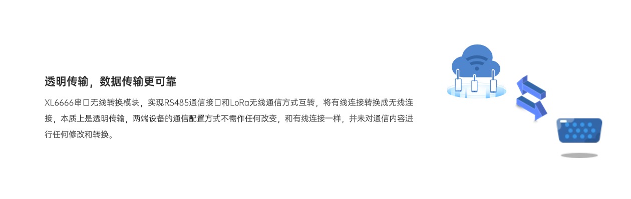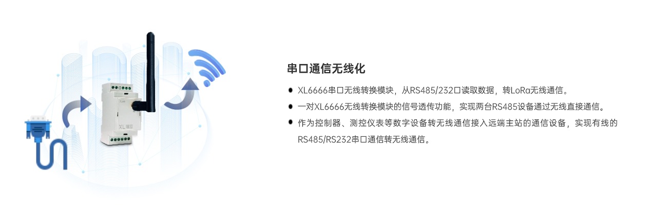 XL6666串口無線轉換模塊,作為控制器、測控儀表、智能設備等接入無線傳感網絡的節點裝置,將RS485串口通信轉換成LoRa無線通信,實現RS485通信口和LoRa無線通信相互轉換。有效解決設備間連接與數據傳輸等問題,使傳統串口設備輕松融入物聯世界。