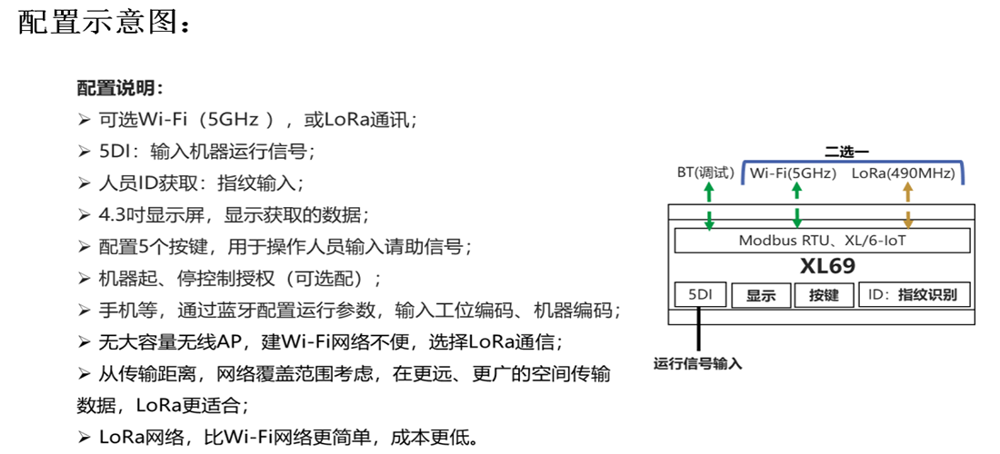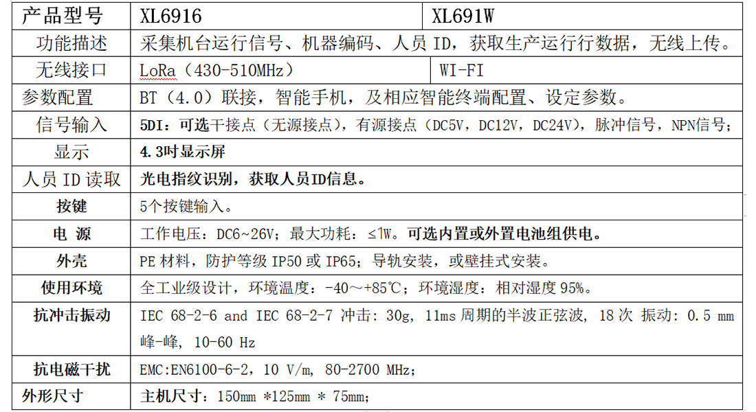 XL69機臺監控裝置,采集機臺、工位人、機生產運行信號:機器運行狀態、人員ID信息及操作時間數據,獲取機器、人員生產運行數據,并對機臺的運行數據進行邊緣計算,統計、分析機臺的設備效率、時間效率、品質效率,及綜合效率。通過無線方式,上傳獲取的數據。