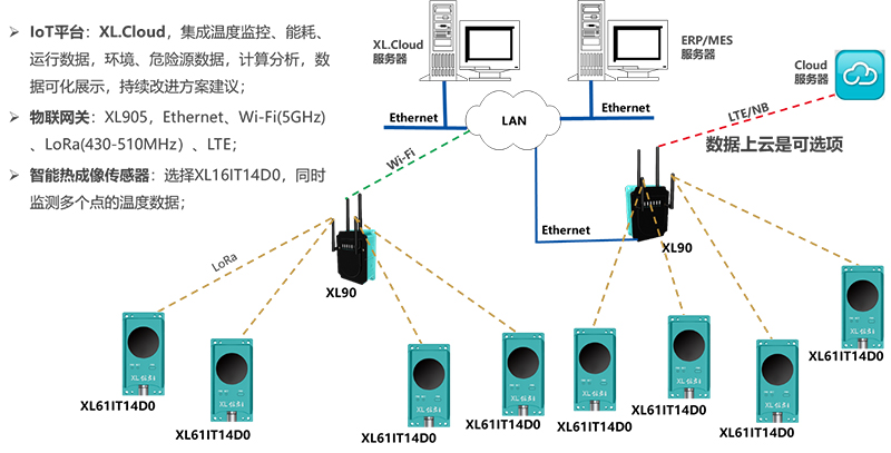 7、配XL90系列物聯網關,轉發溫度數據至電氣(電力)設備溫度監控系統,電力監控系統、DCS、SCADA,及企業MES系統