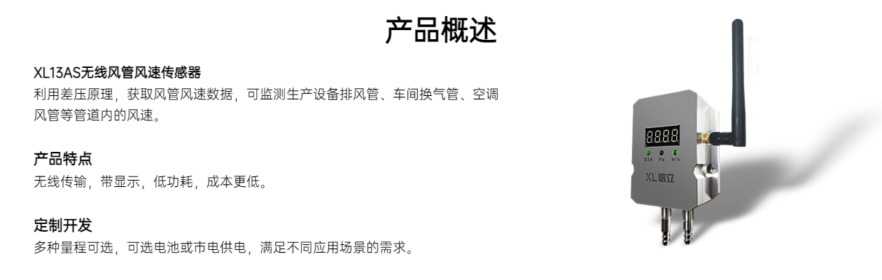 利用差壓原理,獲取風(fēng)管風(fēng)速數(shù)據(jù),可監(jiān)測生產(chǎn)設(shè)備排風(fēng)管、車間換氣管、空調(diào)風(fēng)管等管道內(nèi)的風(fēng)速。