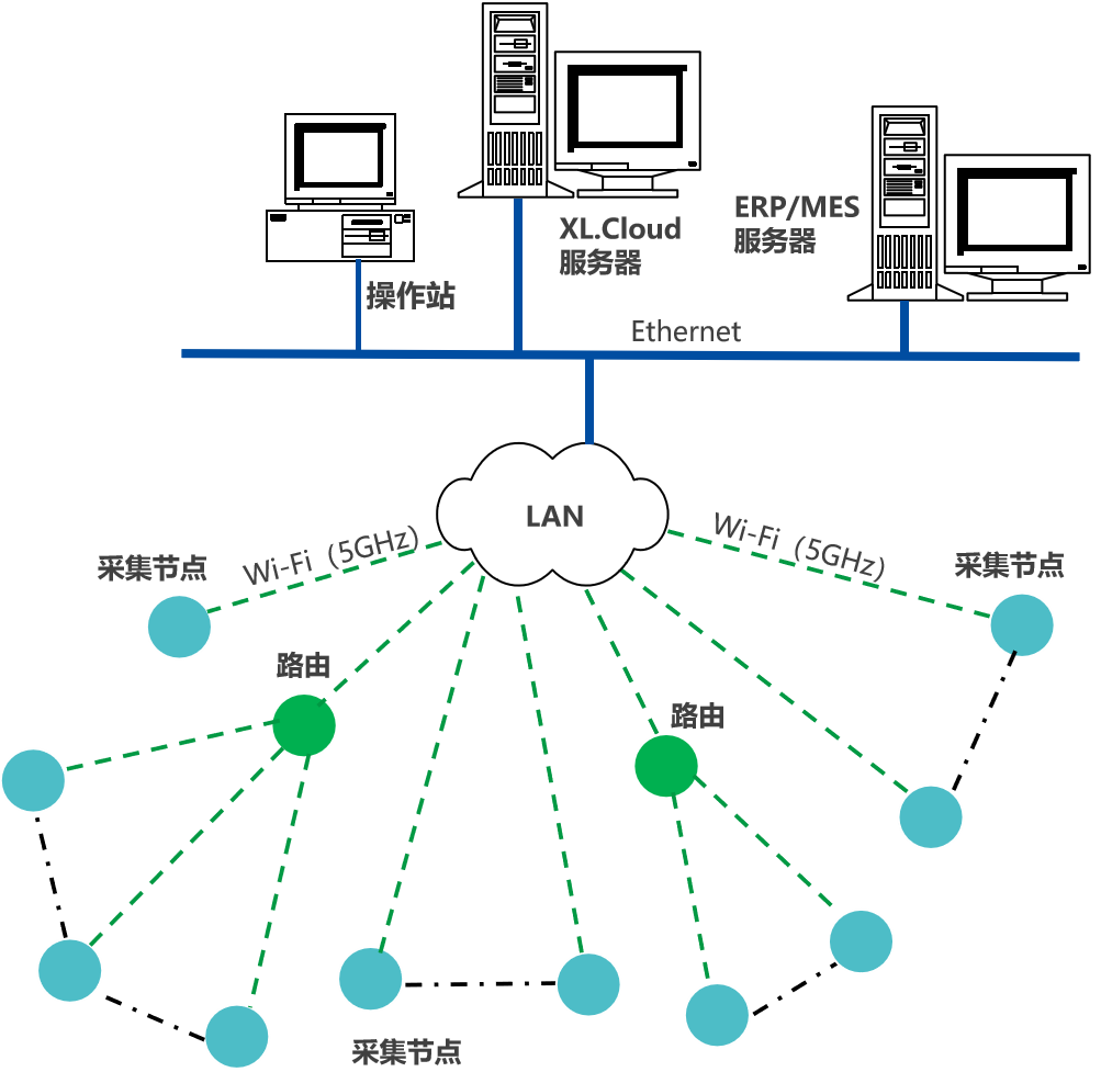 采集節點裝置(智能轉換器、智能主機),通過Wi-Fi(5GHz),接入LAN,推送機器運行數據,至企業生產管控服務器