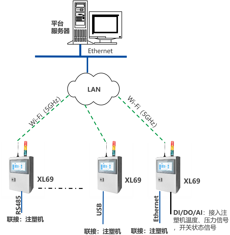 選擇XL60智能采集裝置,采集注塑機運行信號、工藝參數,以及用電參數,上傳至XL90物聯網關