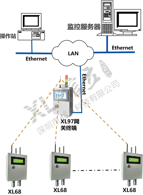 如增加現(xiàn)場(chǎng)集中監(jiān)控點(diǎn),可配置XL97網(wǎng)關(guān)終端,讀取區(qū)域內(nèi)XL68上傳的數(shù)據(jù),分析處理、顯示、報(bào)警,并轉(zhuǎn)發(fā)至監(jiān)控中心服務(wù)器。