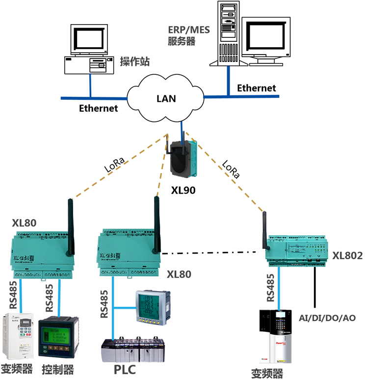 對采集點數(shù)據(jù)量小,需要Ethernet、RS485、CAN、USB 等通信接口讀取數(shù)據(jù),要聯(lián)接多臺設備,選擇XL80智能主機,配置LoRa通信。