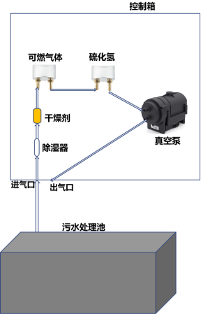 l 過程:用聚四氟乙烯管,聯(lián)接整個(gè)氣體通路。管直接伸入污水池,聯(lián)接控制箱進(jìn)氣口,氣體從進(jìn)氣口,至過濾器、除濕器,至傳感器探頭進(jìn)、出氣口(兩臺(tái)傳感器的進(jìn)、出氣口串聯(lián)),至真空泵抽氣口,從真空泵排氣口聯(lián)接控制箱出氣口;