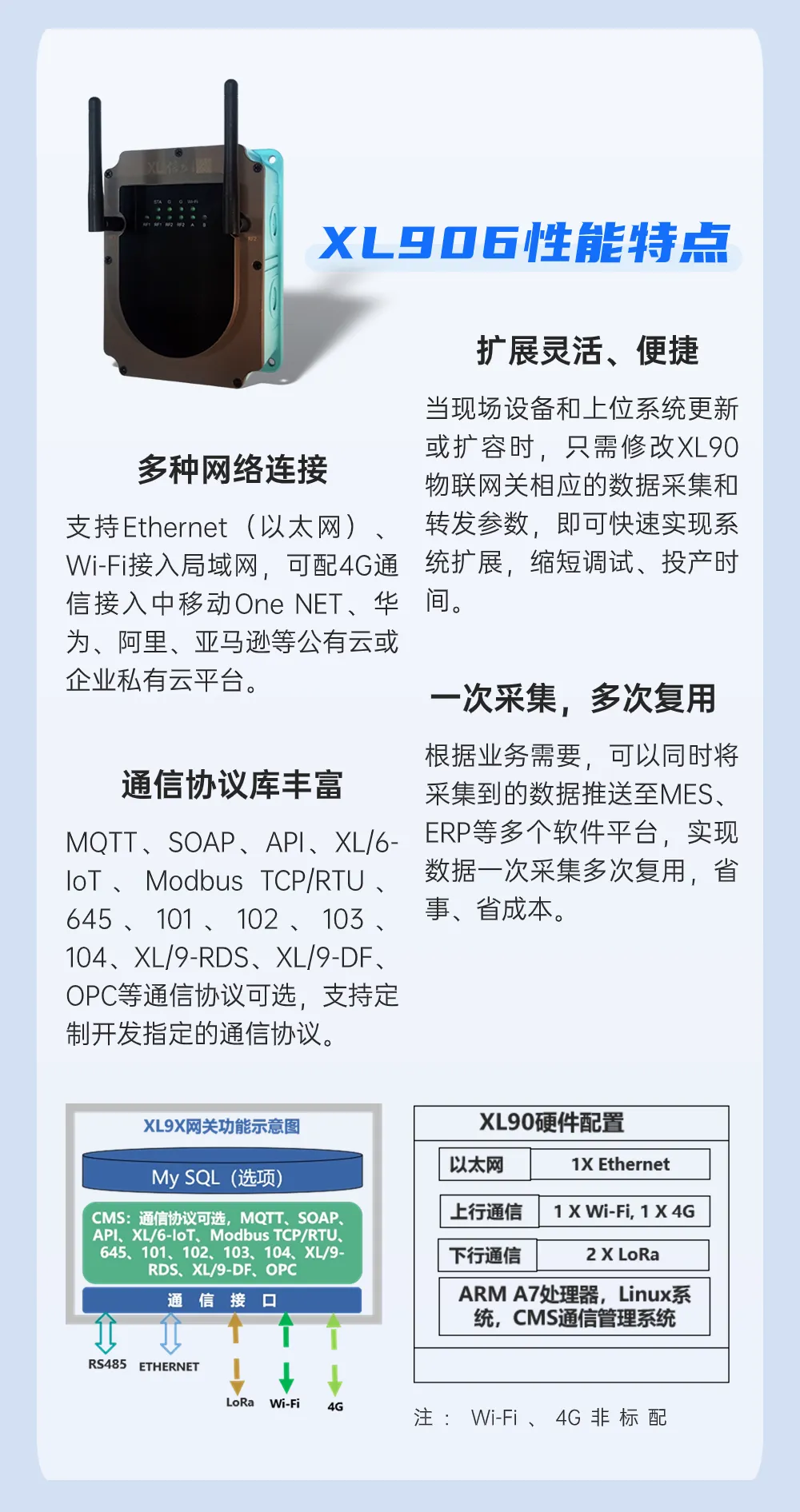 選擇XL90物聯(lián)網(wǎng)關(guān),無線讀取XL65無線采集模塊的溫度數(shù)據(jù),上傳至監(jiān)控平臺。