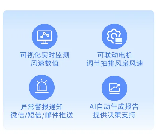 根據(jù)現(xiàn)場(chǎng)需求,可聯(lián)動(dòng)電機(jī),當(dāng)風(fēng)速過(guò)小或者過(guò)大,自動(dòng)調(diào)節(jié)抽排風(fēng)扇的轉(zhuǎn)速,以保持風(fēng)速控制在合適范圍內(nèi)。