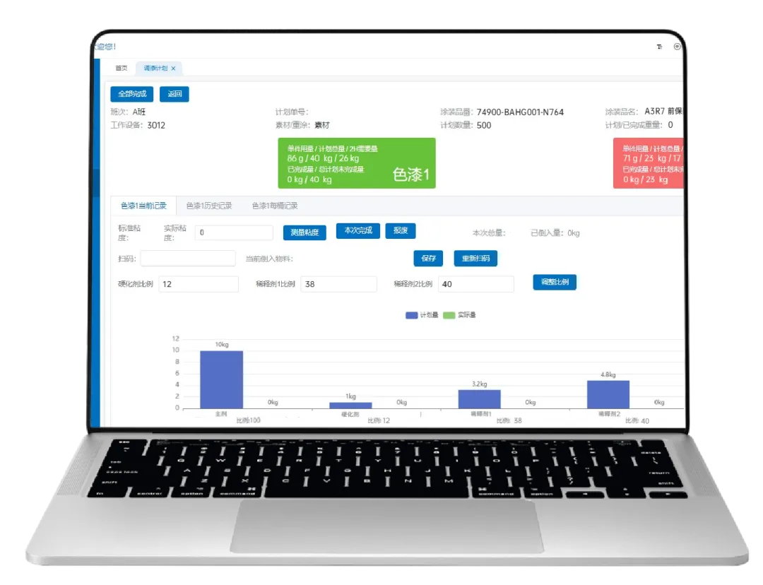 系統采用可視化直觀調漆界面設計,智能匹配調漆工藝,自動計算主劑、固化劑、稀釋劑需要的重量,以色塊的形式實時顯示已倒入的原料重量。