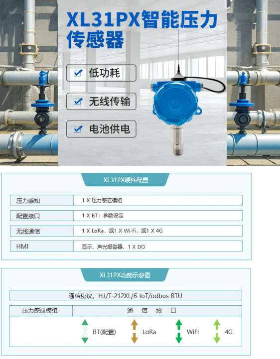 XL31PX智能壓力傳感器通過4G無線通信技術,實現遠距離、快速傳輸壓力數據至云平臺。